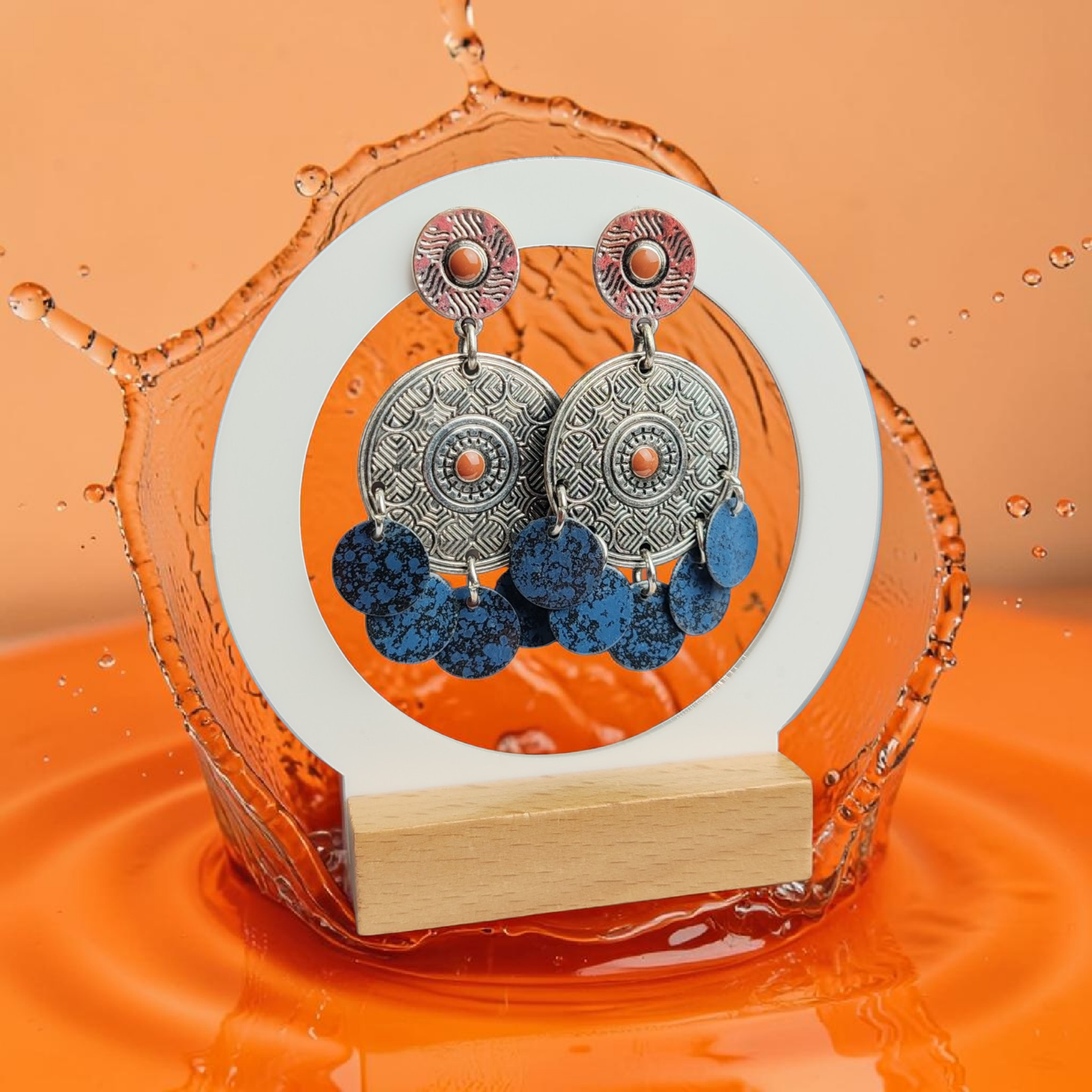 🔵 Antikolt hatású fülbevaló kék mozgó elemekkel és mintás koronggal.