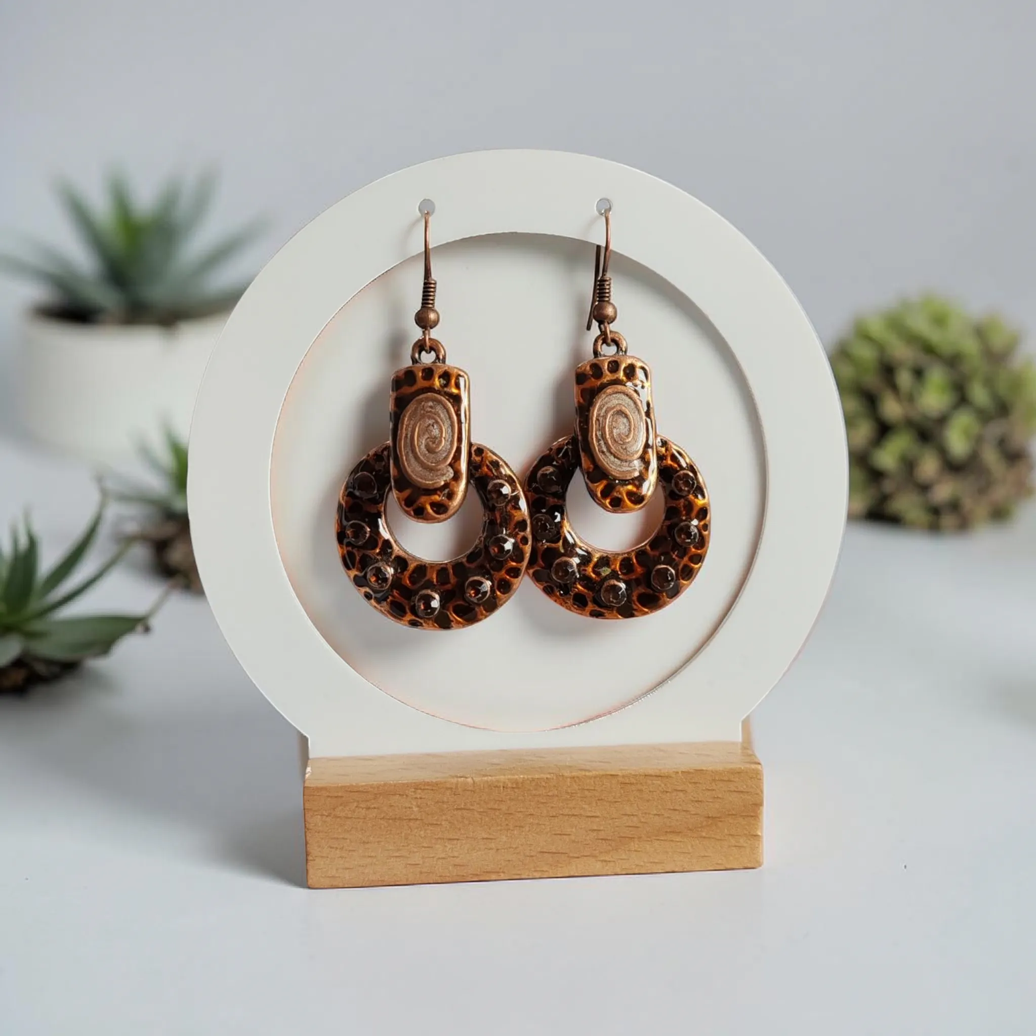🟤 Barna kövekkel díszített, mintás fülbevaló bronz alappal.