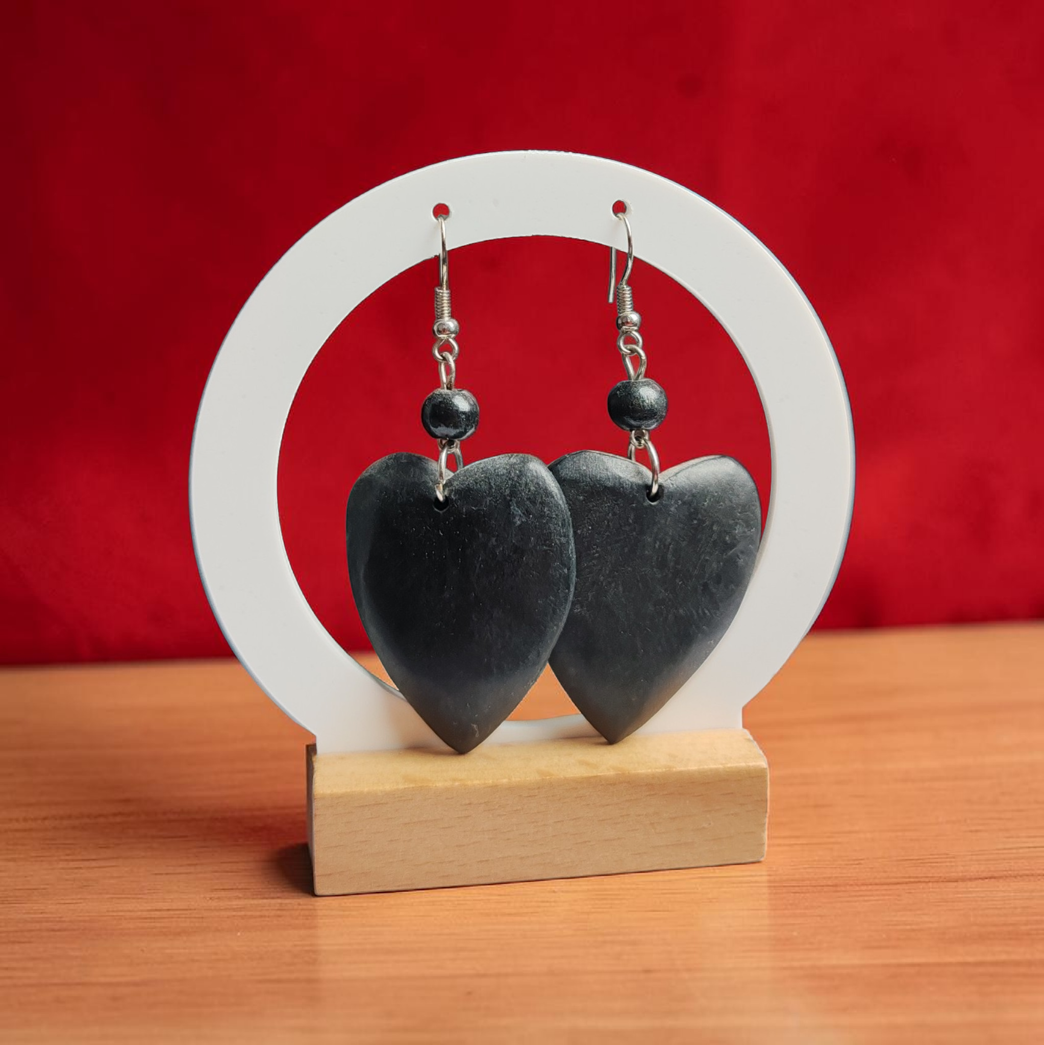 ⚫ Természetes hatású, fa szív formájú fülbevaló ezüst színű akasztóval.