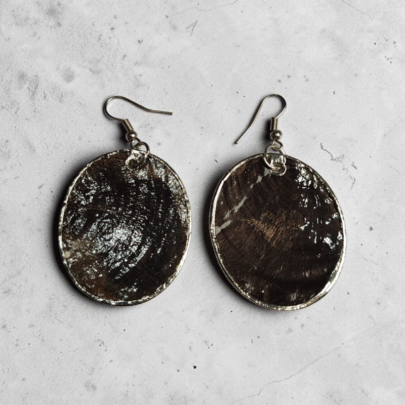 🟤 Fa mintás, kerek lógós fülbevaló ezüstszínű alappal.