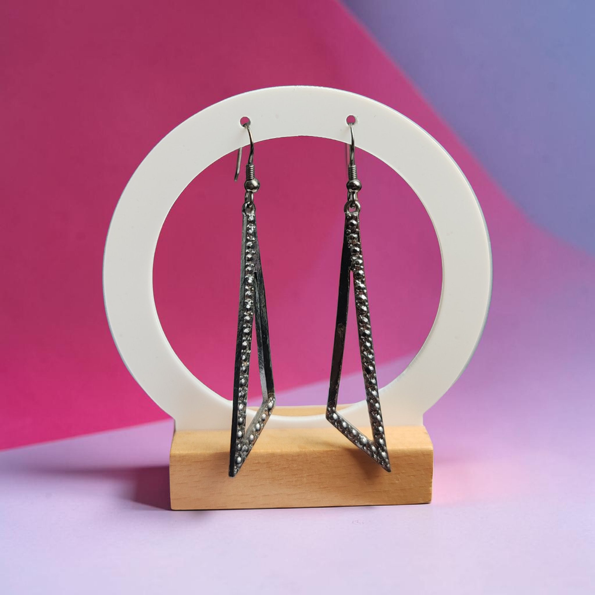 🖤 Füst színű, geometrikus lógós fülbevaló modern stílusban.