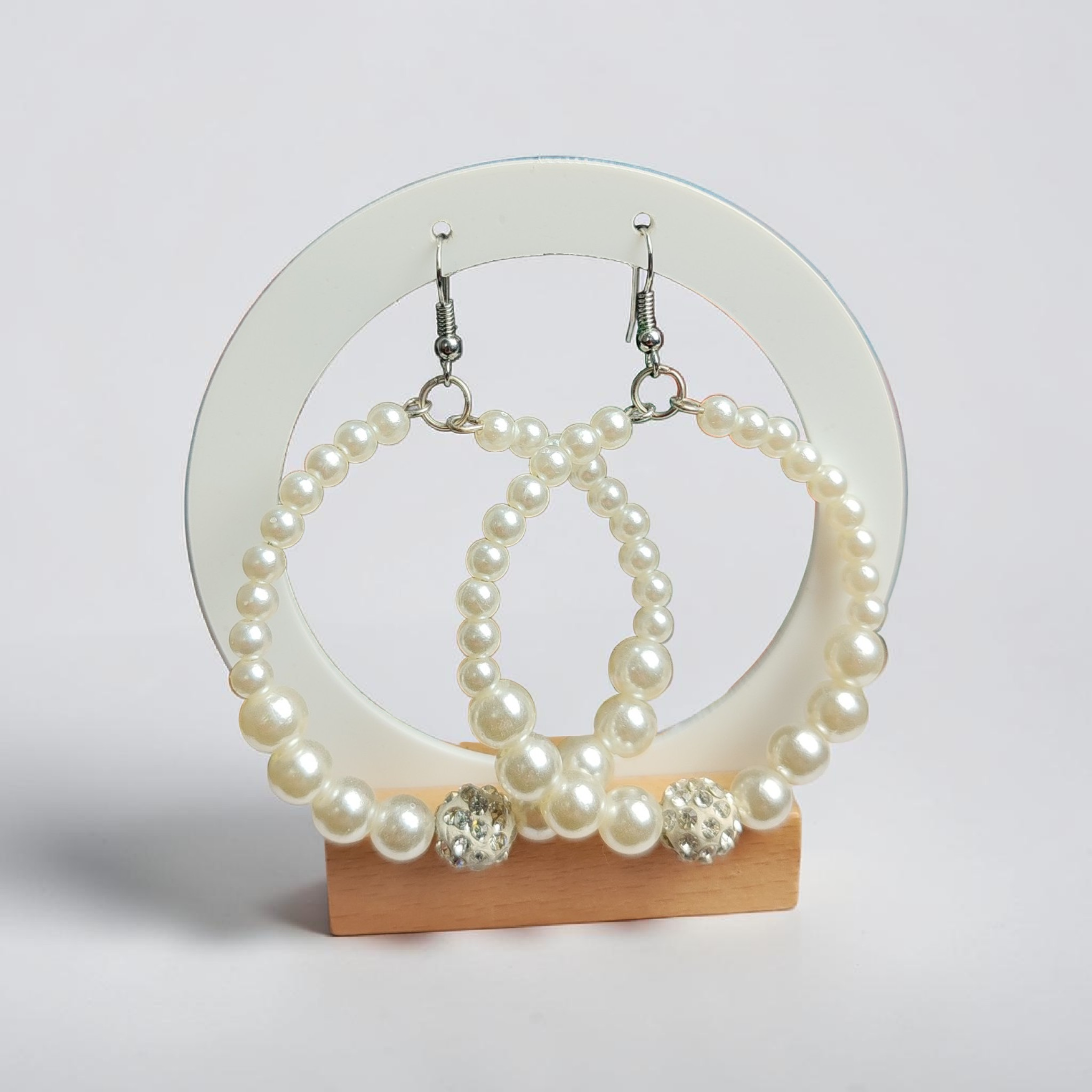 ⚪ Gyöngyös, karika formájú lógós fülbevaló ezüstszínű alappal.