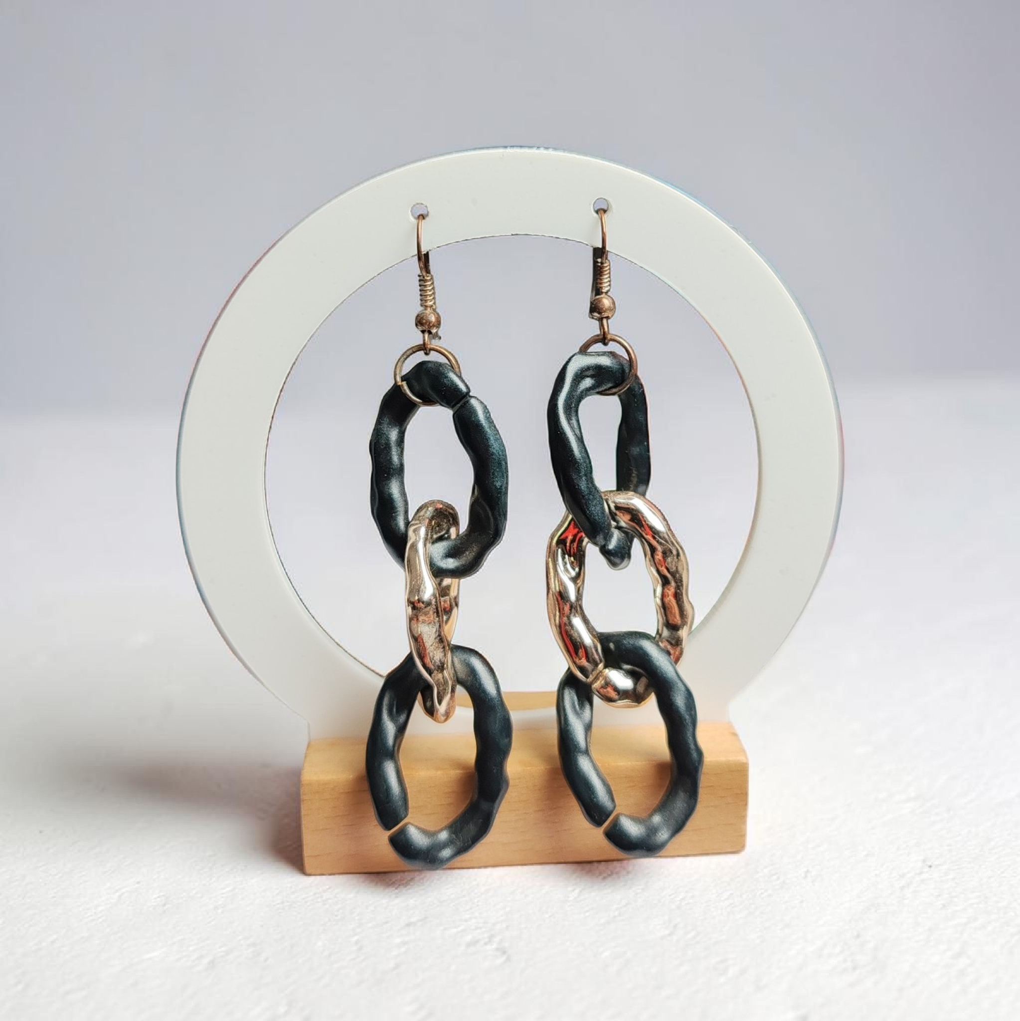 🟡⚫ Láncszemes, lógós fülbevaló bronz alappal fekete-arany színben.