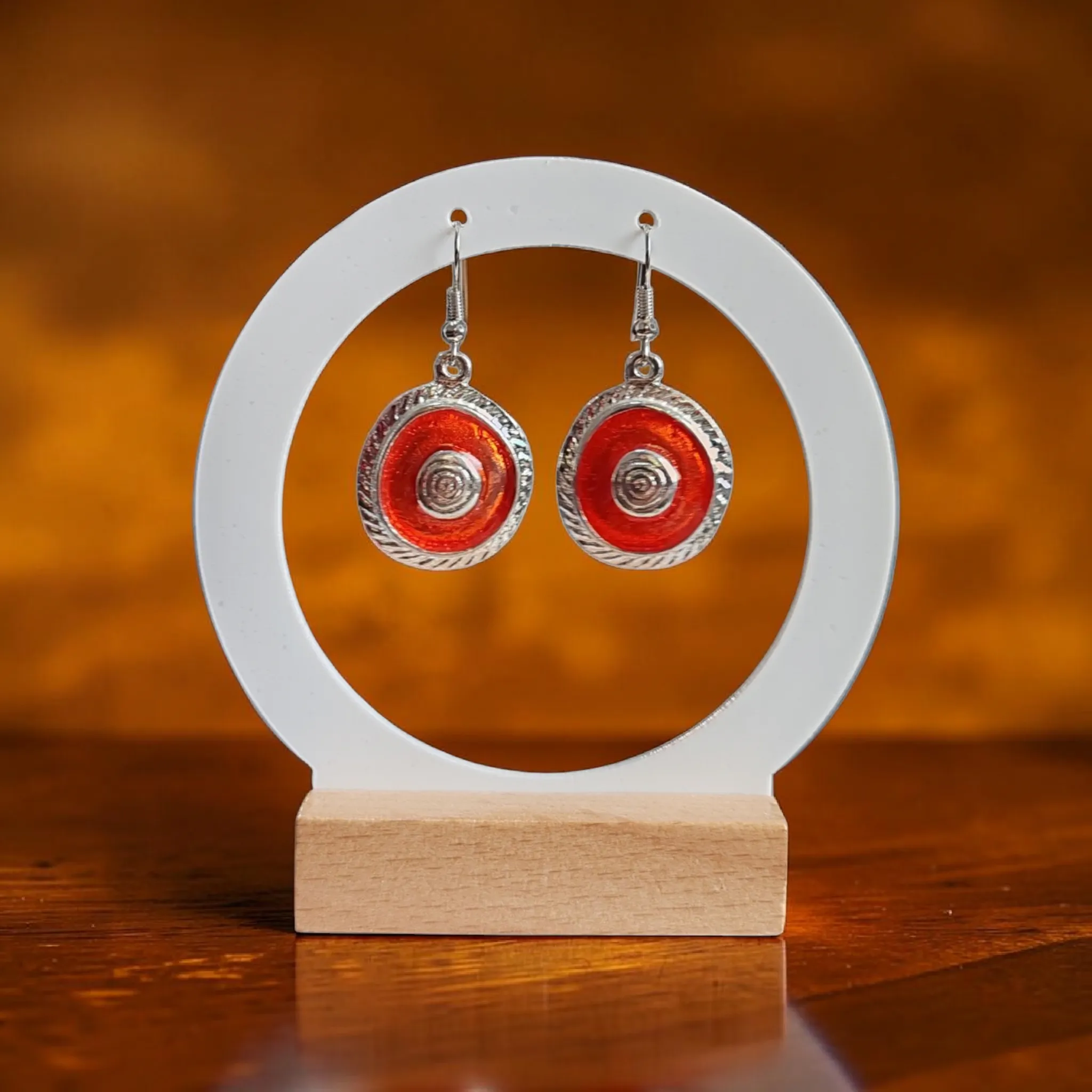 🟠 Narancs betétes, kör formájú lógós fülbevaló ezüstszínű alappal.