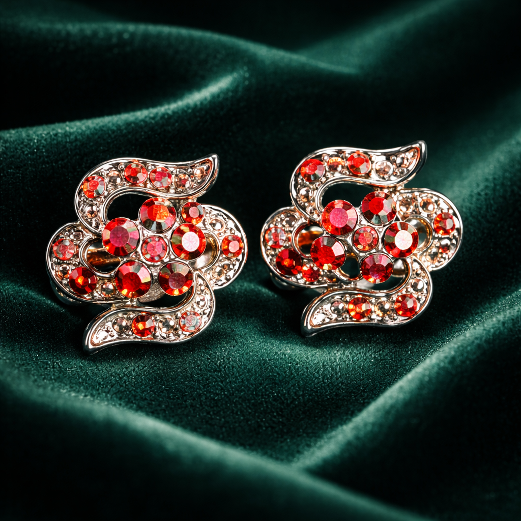 🔴 Piros kövekkel díszített, mintás klipszes fülbevaló ezüstszínű alappal.