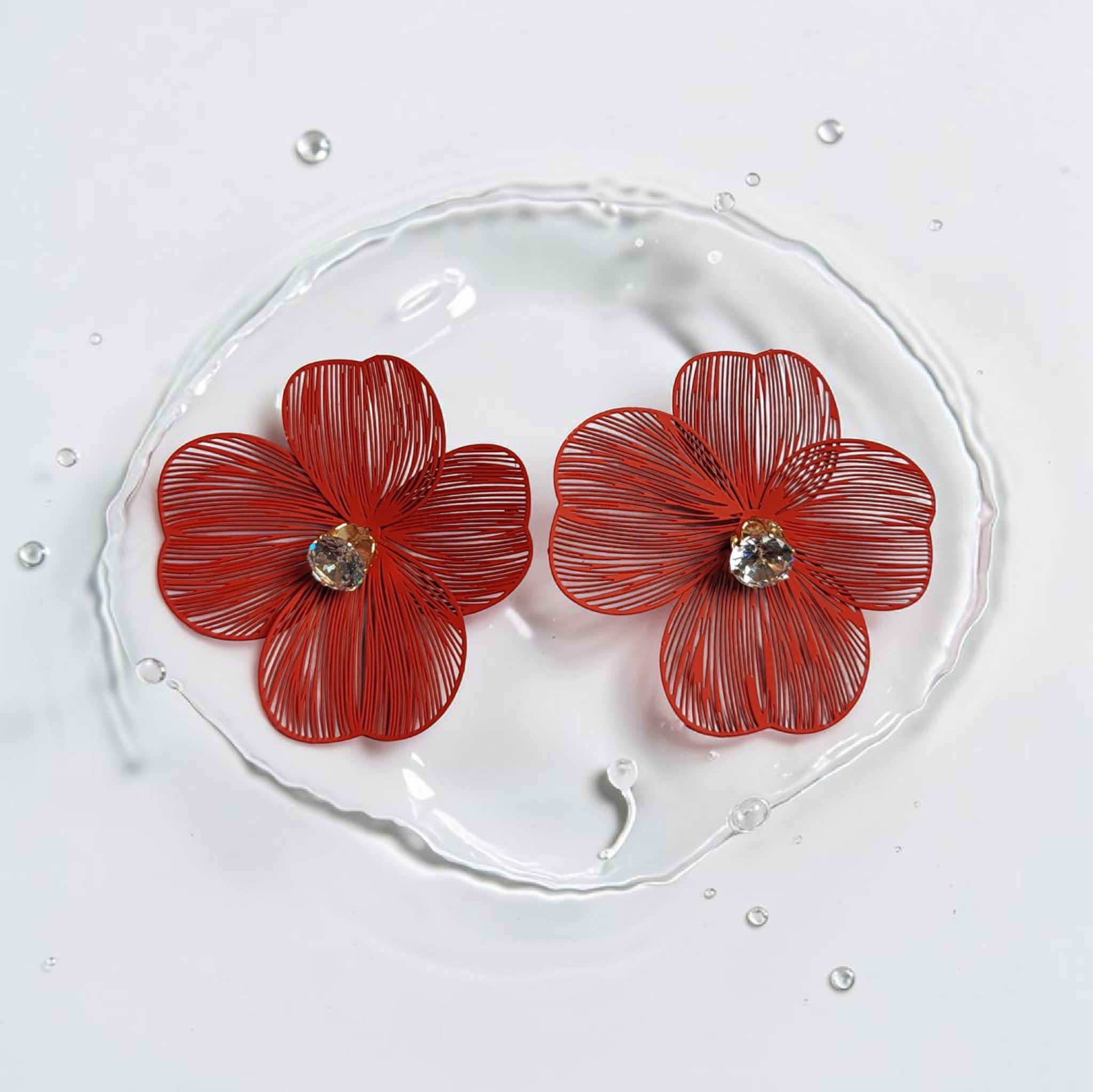 🔴 Piros virág fülbevaló csillogó kristály középpel.