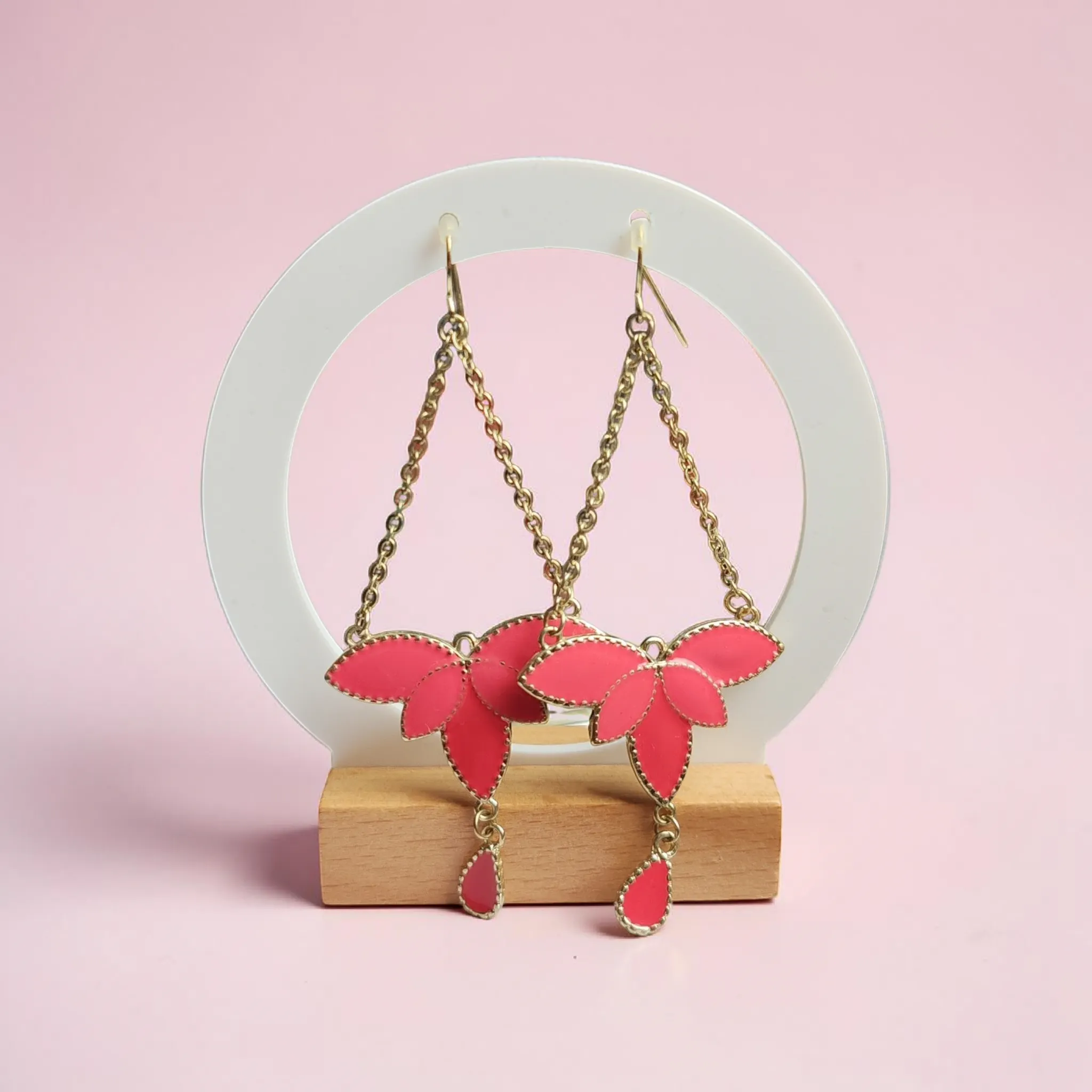 🌸 Rózsaszín virág mintás, lógós fülbevaló aranyszínű lánccal.