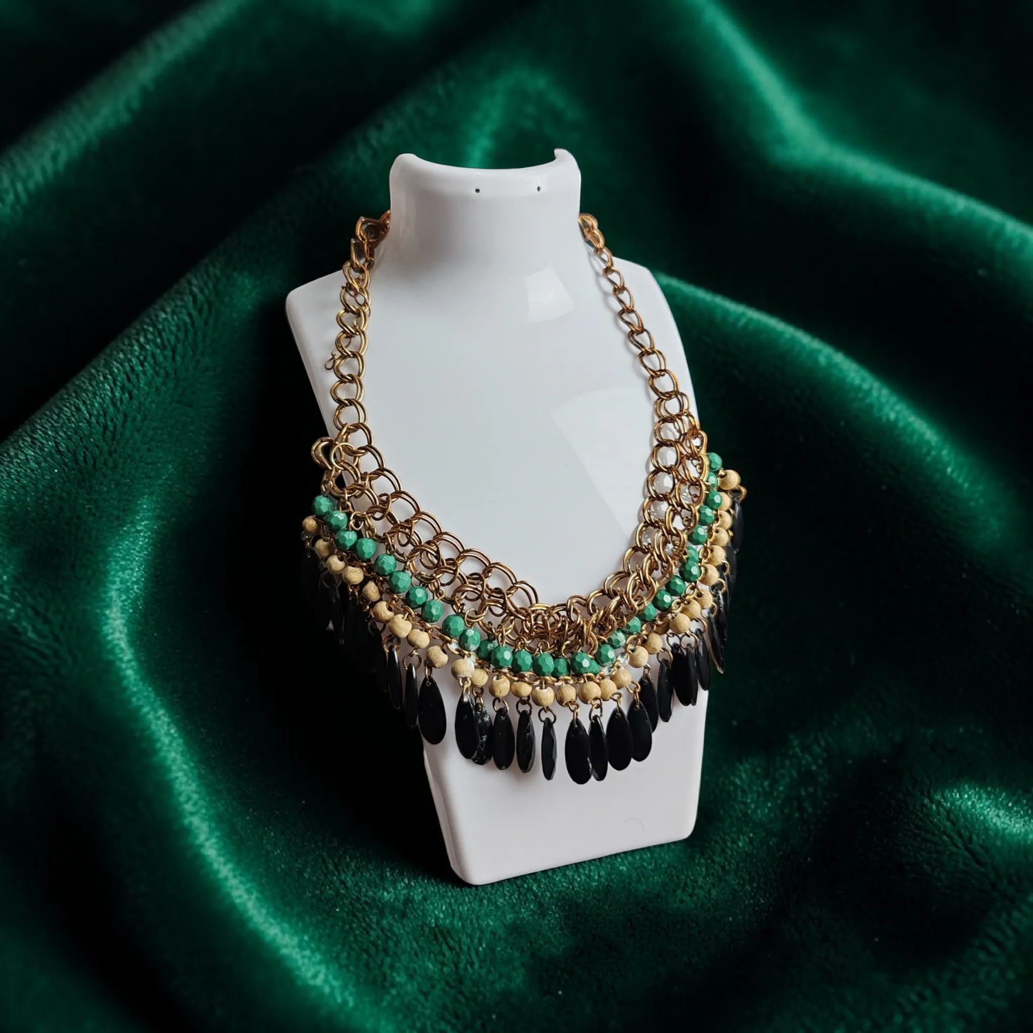🟢 Látványos bizsu nyaklánc arany lánccal, zöld, fekete és fa gyöngyökkel, réteges kialakítással.