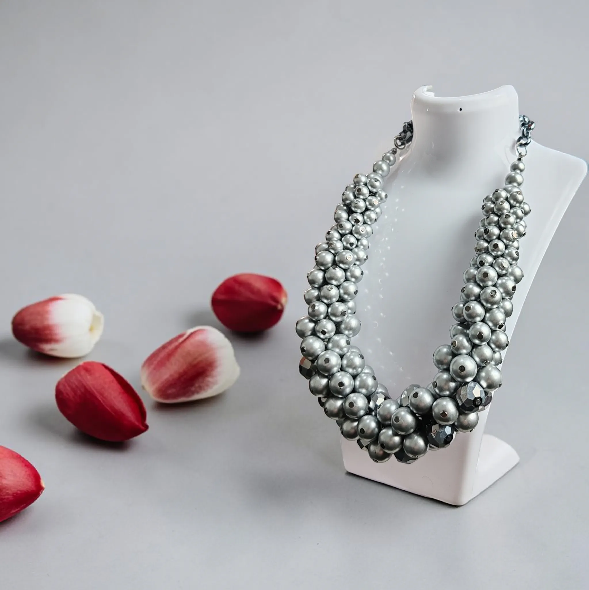 ✨ Elegáns, ezüst színű többszálas nyaklánc fényes és diszkógömb hatású gyöngyökkel.
