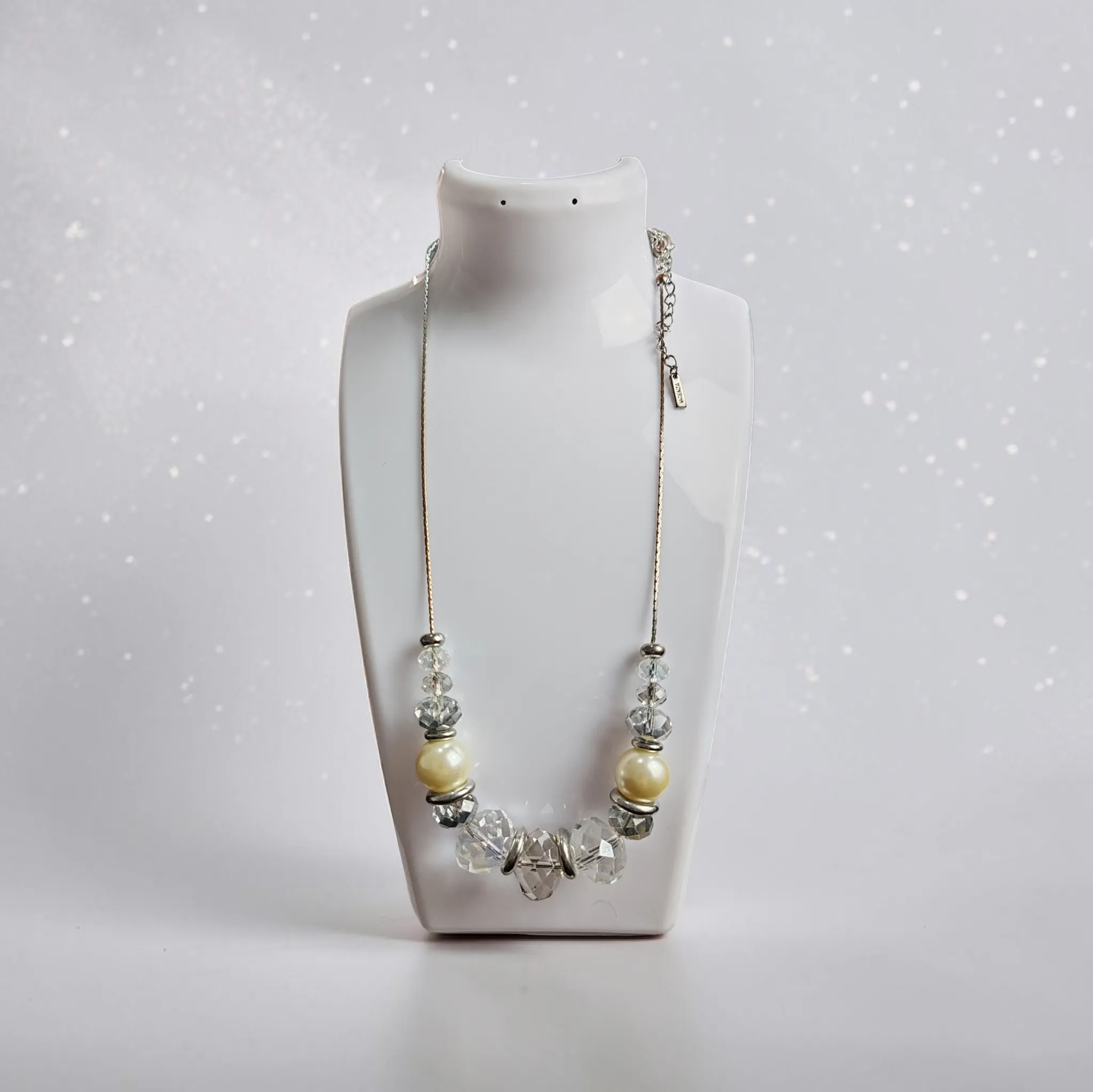 Ezüst láncos nyaklánc bézs gyöngyökkel és kristály díszítéssel