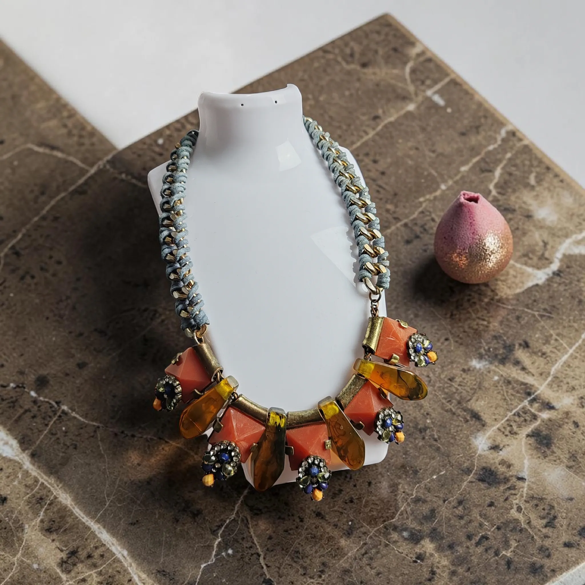 🔶 Karakteres bizsu nyaklánc bőr lánccal, téglavörös és borostyán hatású díszítésekkel.