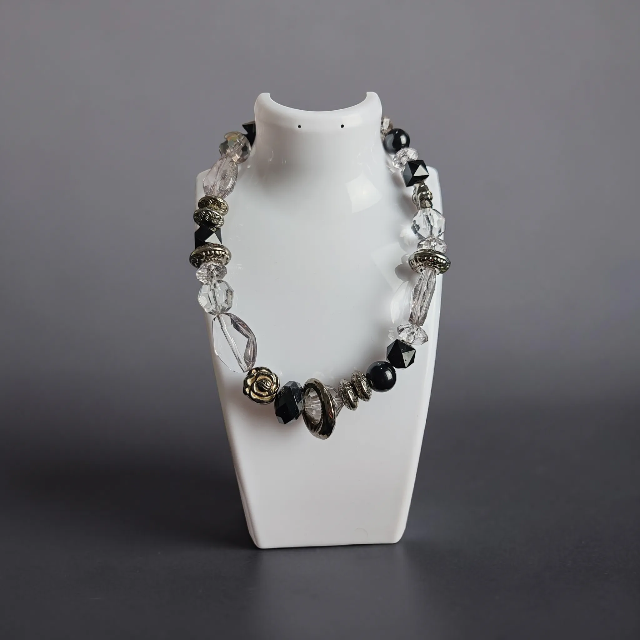⚫ Elegáns bizsu nyaklánc ezüst lánccal, fekete és áttetsző kristályelemekkel.