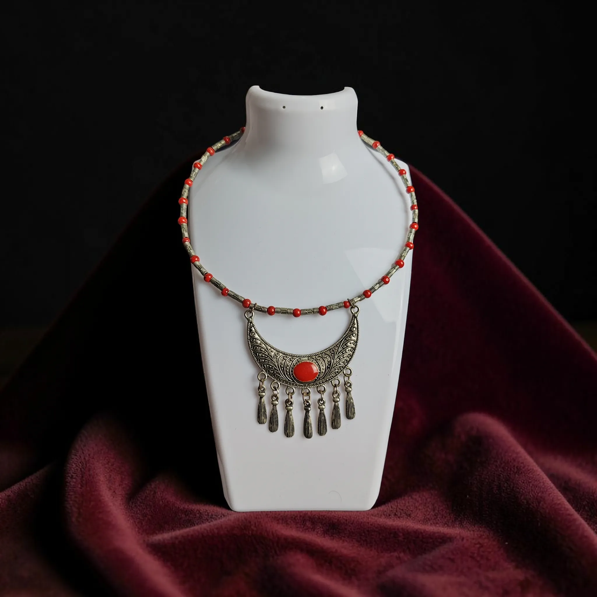 🔴 Feltűnő bizsu nyaklánc merev, kör alakú lánccal, piros elemekkel és díszes fém medállal.