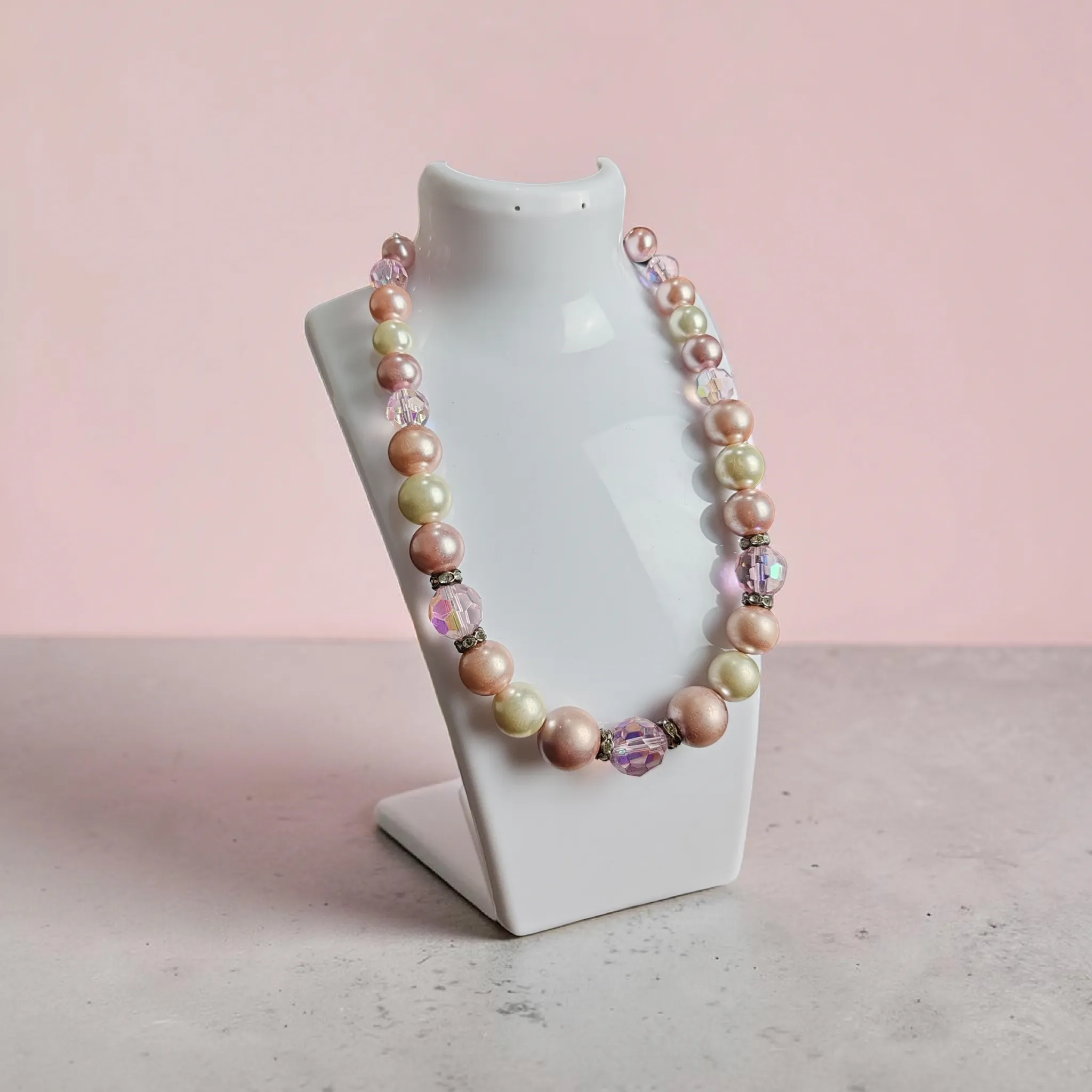 🔹 Nőies bizsu nyaklánc rózsaszín és bézs gyöngyökkel, finom kristály részletekkel.