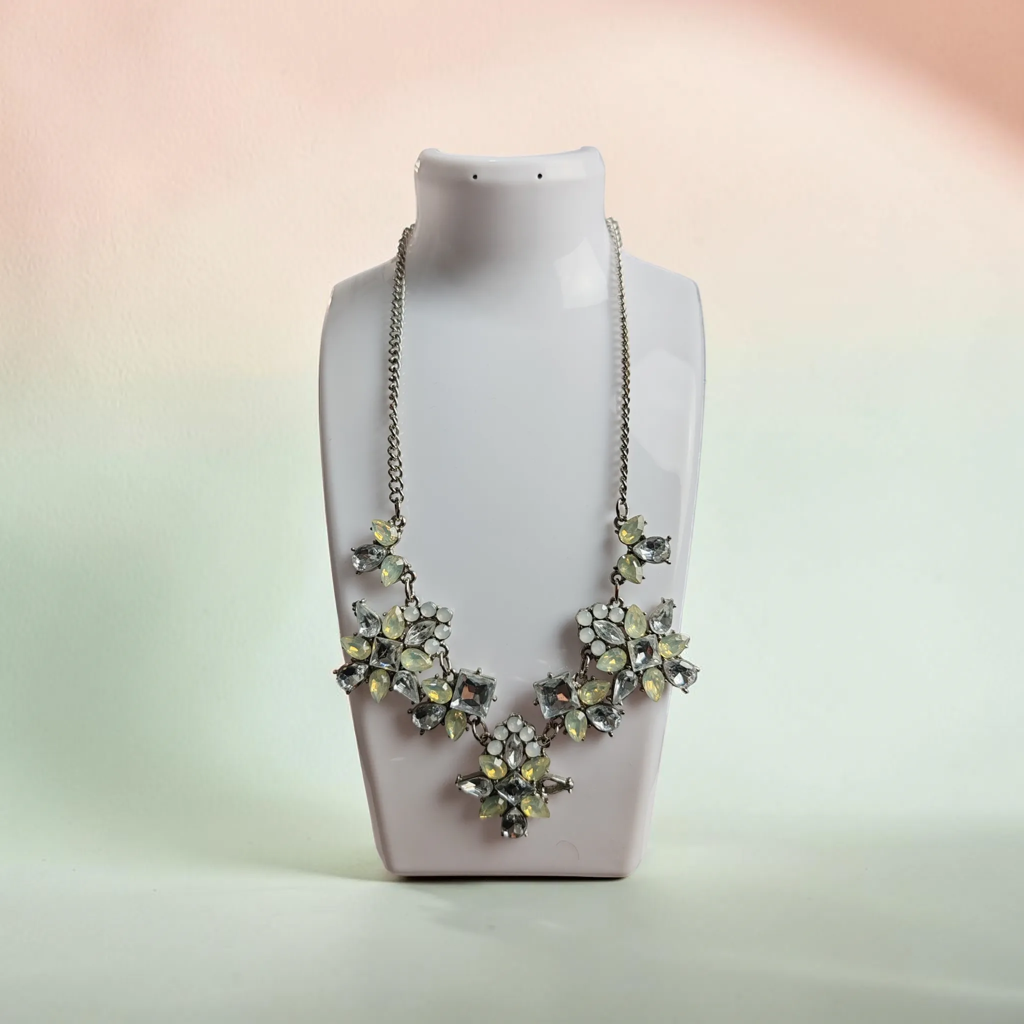 Ezüst színű bizsu nyaklánc zöld-fehér kristály virág medálokkal