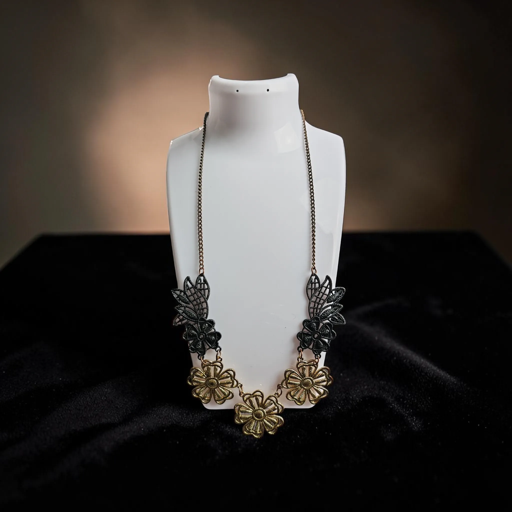 🌼 Különleges, horgolt hatású fém díszítéssel készült nyaklánc fekete és arany virágmintával.