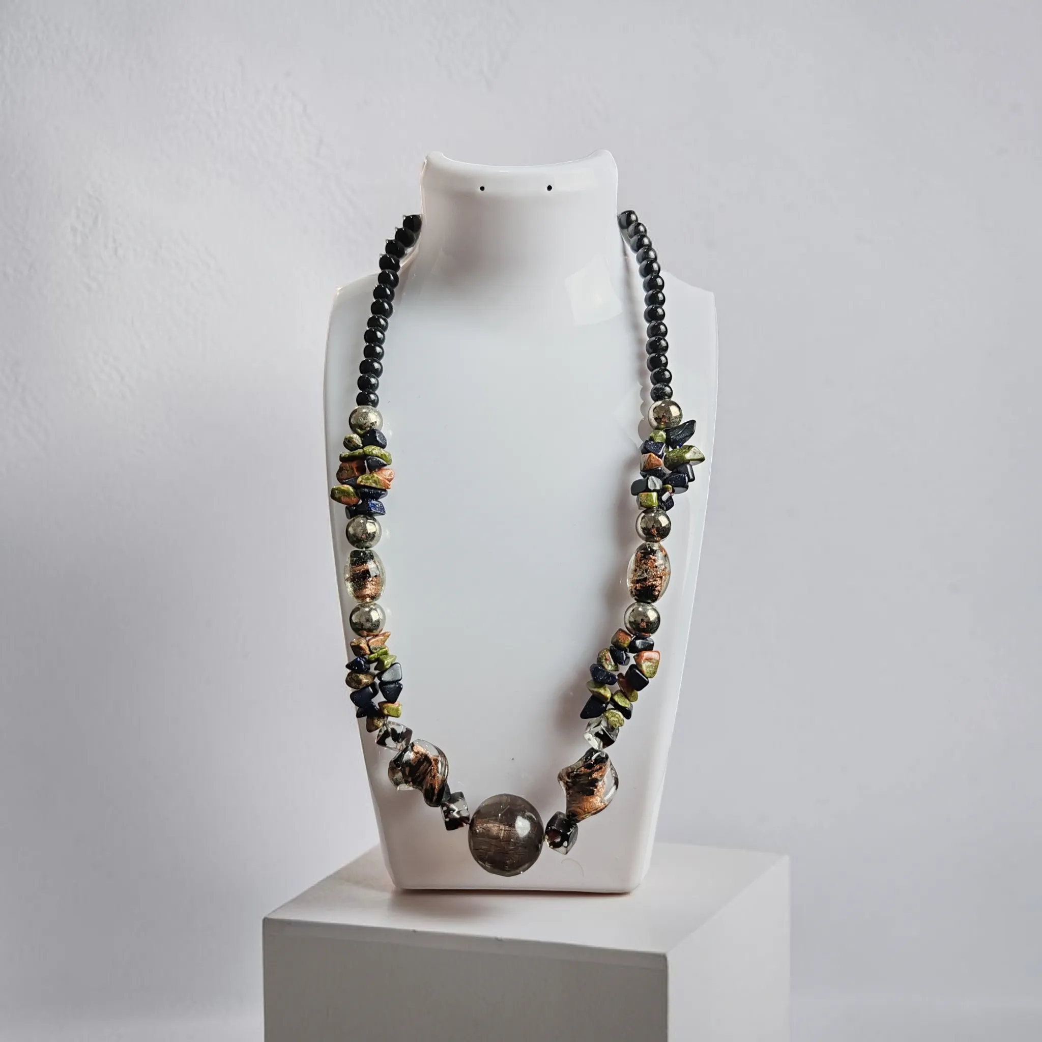 ⚫ Egyedi hatású nyaklánc fekete gyöngyökkel és változatos, természetes kő jellegű betétekkel.
