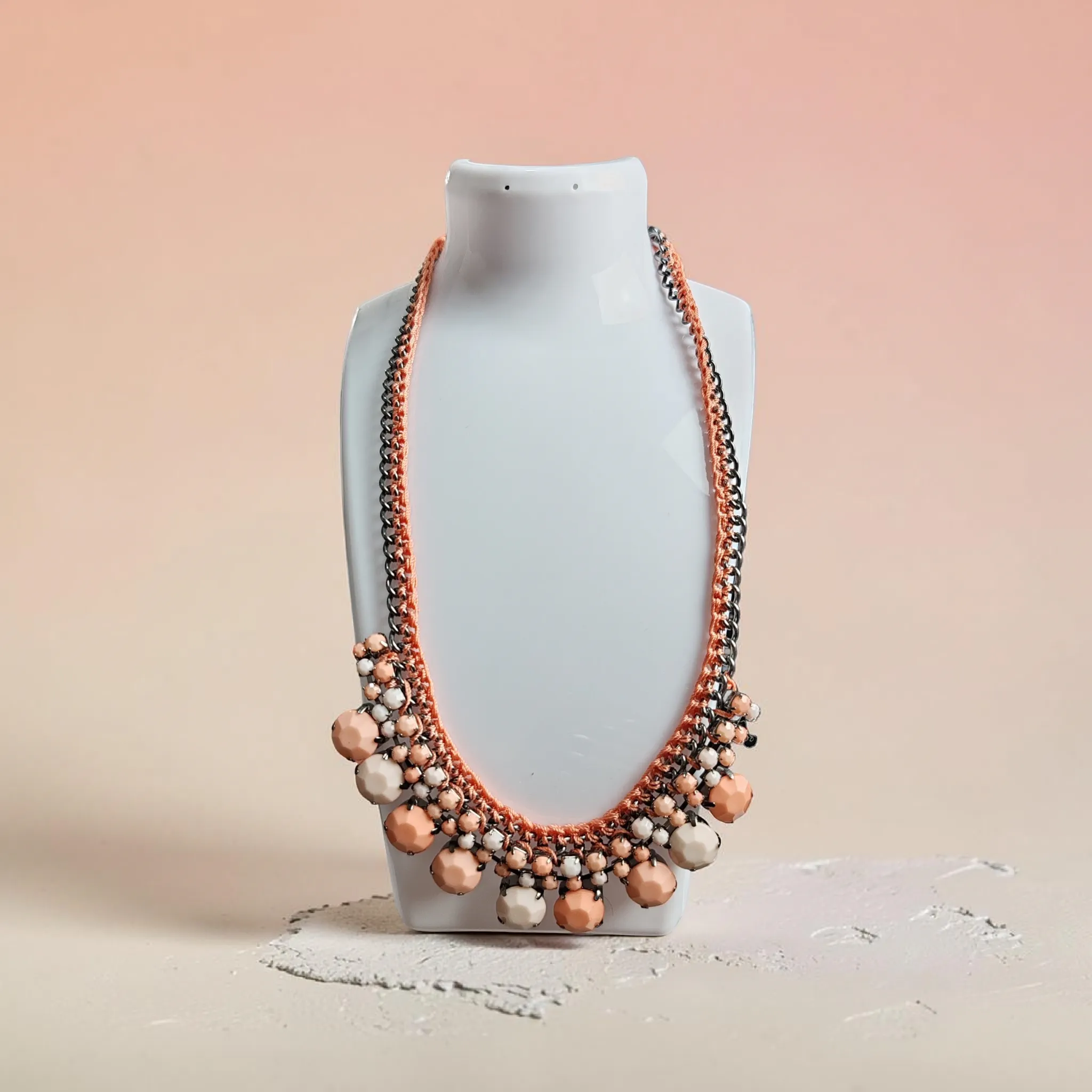 🌸◼️ Különleges nyaklánc fém lánccal és rózsaszín horgolt szállal, díszes, több árnyalatú medálokkal.